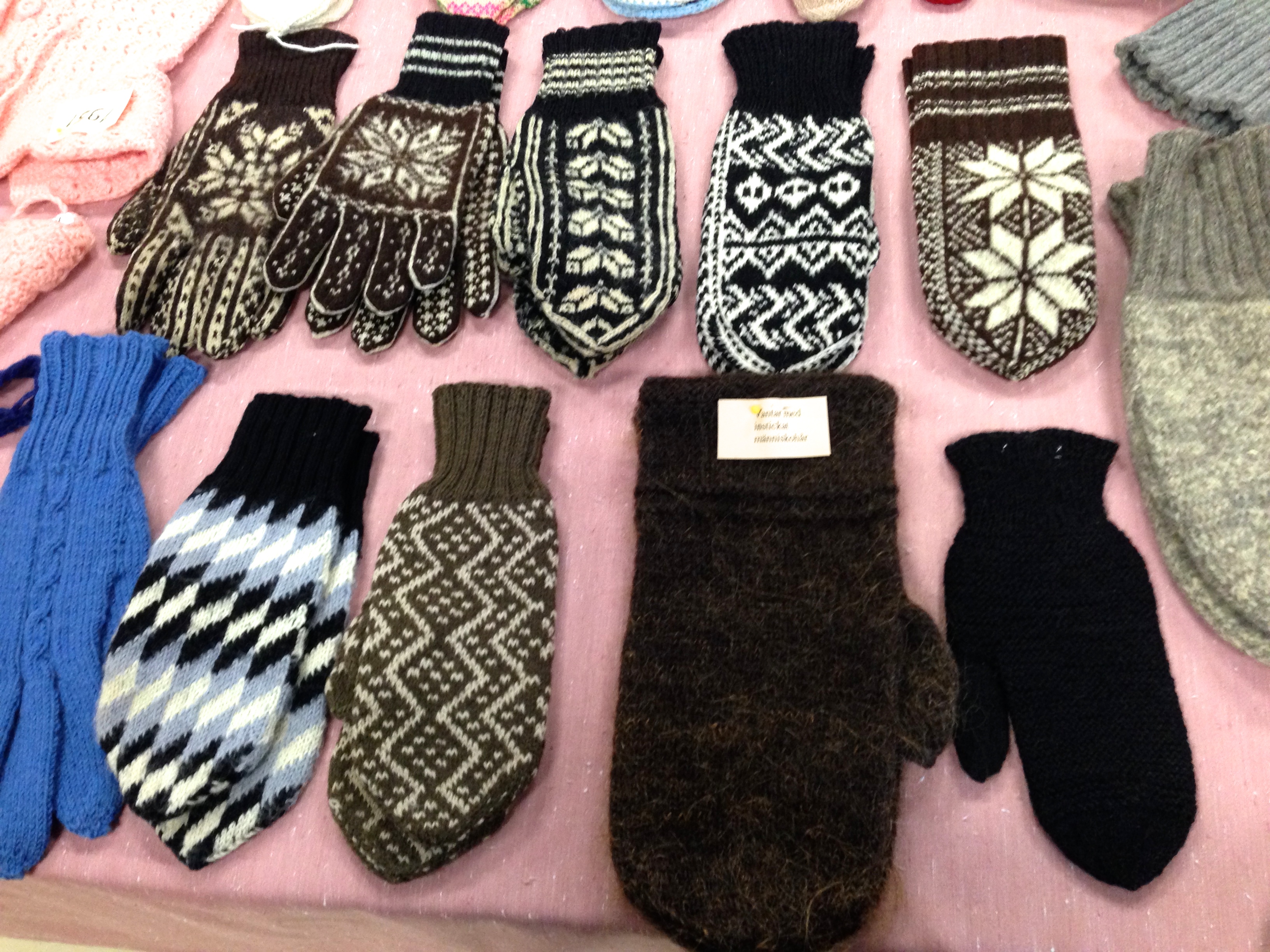 Mittens and gloves with influences from Norway. The big mittens have human hair knitted into them for stronger wear. They also resist water well.