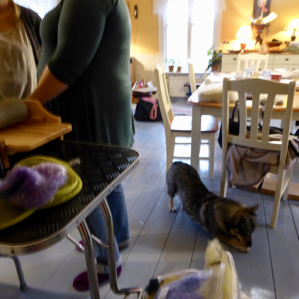 I made it! It was crowded, but it worked. At one point there was a baby on the floor learning how to crawl while his mother learned how to spin, and he had a tough job: he crawled into dangerous corners all the time, and was picked up and moved to a “safer” place: believe me, there are no safe places for babies in my spinning room! That was an awesome child, he was happy for hours! And so was the other baby who was so young he slept most of the time. We were not a silent bunch of people… I’m still quite taken by these two new humans and their ability to stay calm in such a noice. Kasper added to the cacophony because no one had time to scratch him…