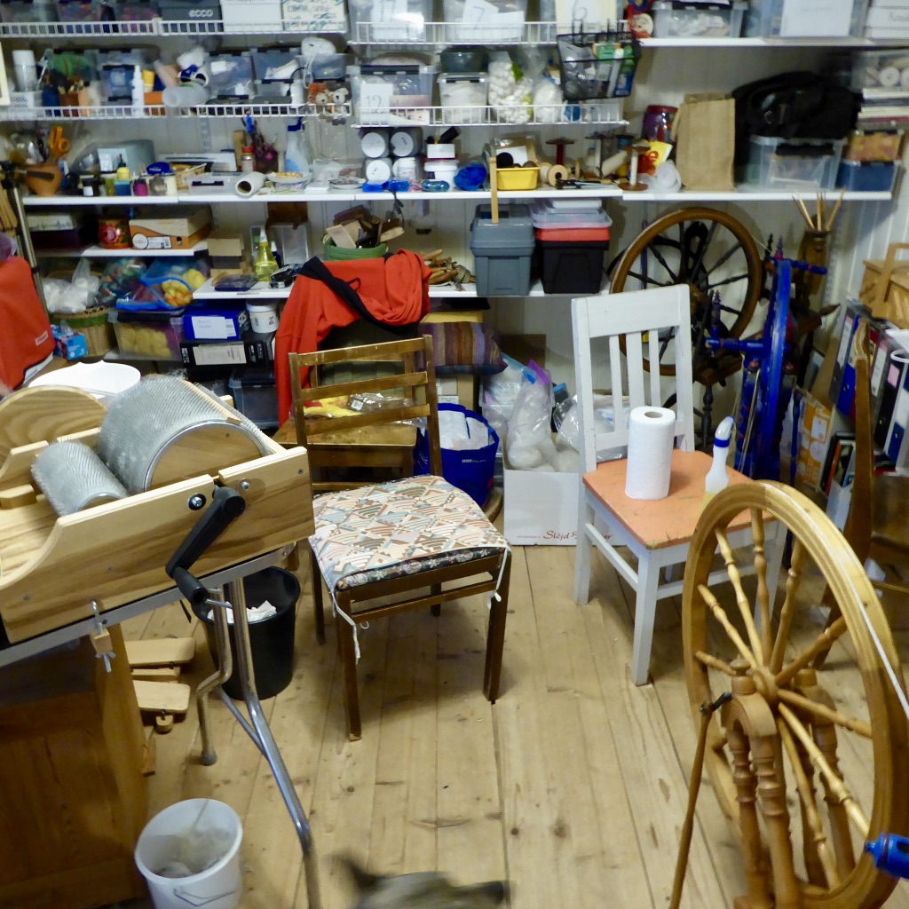 I moved the fibre prep downstairs, with good help from my husband. As you can see in the first photo, Kasper was also helping as he always does! Today dear hubby has carried all the carders, drum carder table, wool, books etc upstairs again. And I have decided to keep all the wheel ready for work instead of pushing them against the walls and being forced to untangle them from each other if I want to use the one that was pushed next to the wall with all the others in front. Somehow I got more space with that arrangement. Don’t ask me how 🙂
