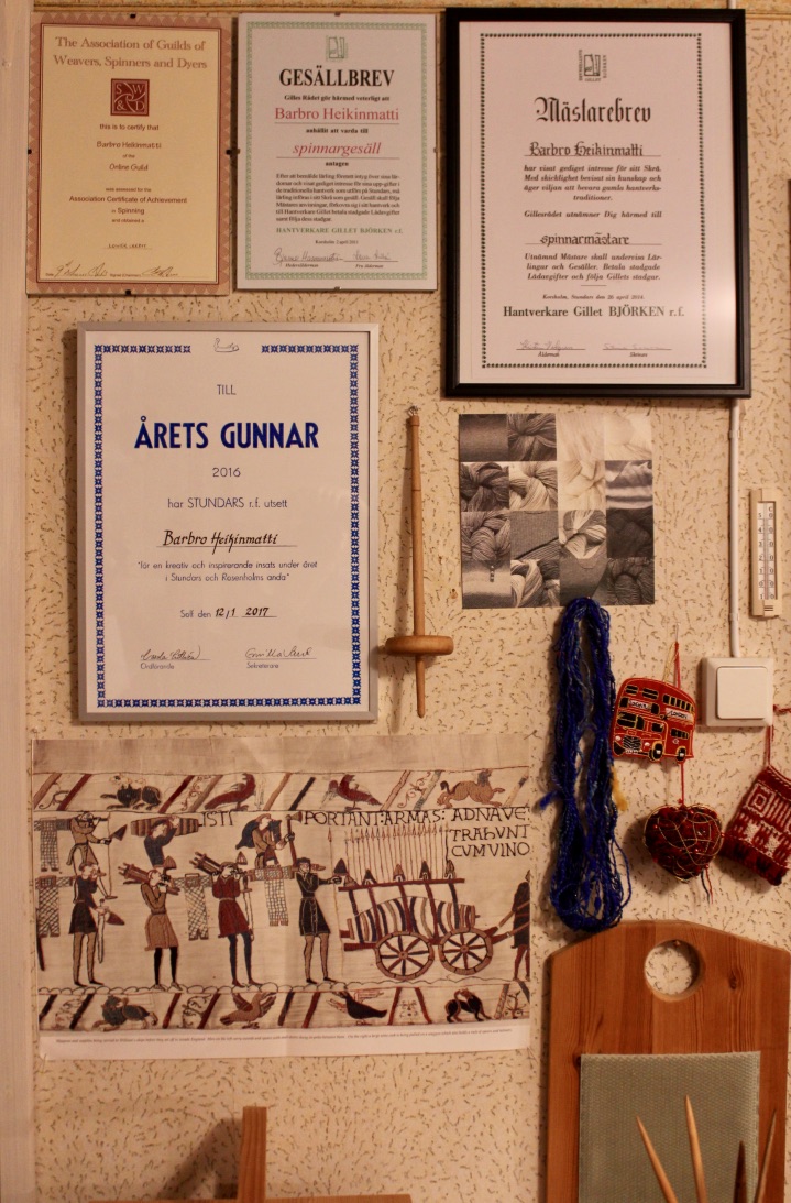 Three of the diplomas on a wall in my spinning room are hand printed at Stundars’ printing museum. If I receive more diplomas I have to move the picture showing a part of the  Bayeux tapestry… it’s been with me for decades, an inspiration for a handspinner to spin fine and even threads for making art.