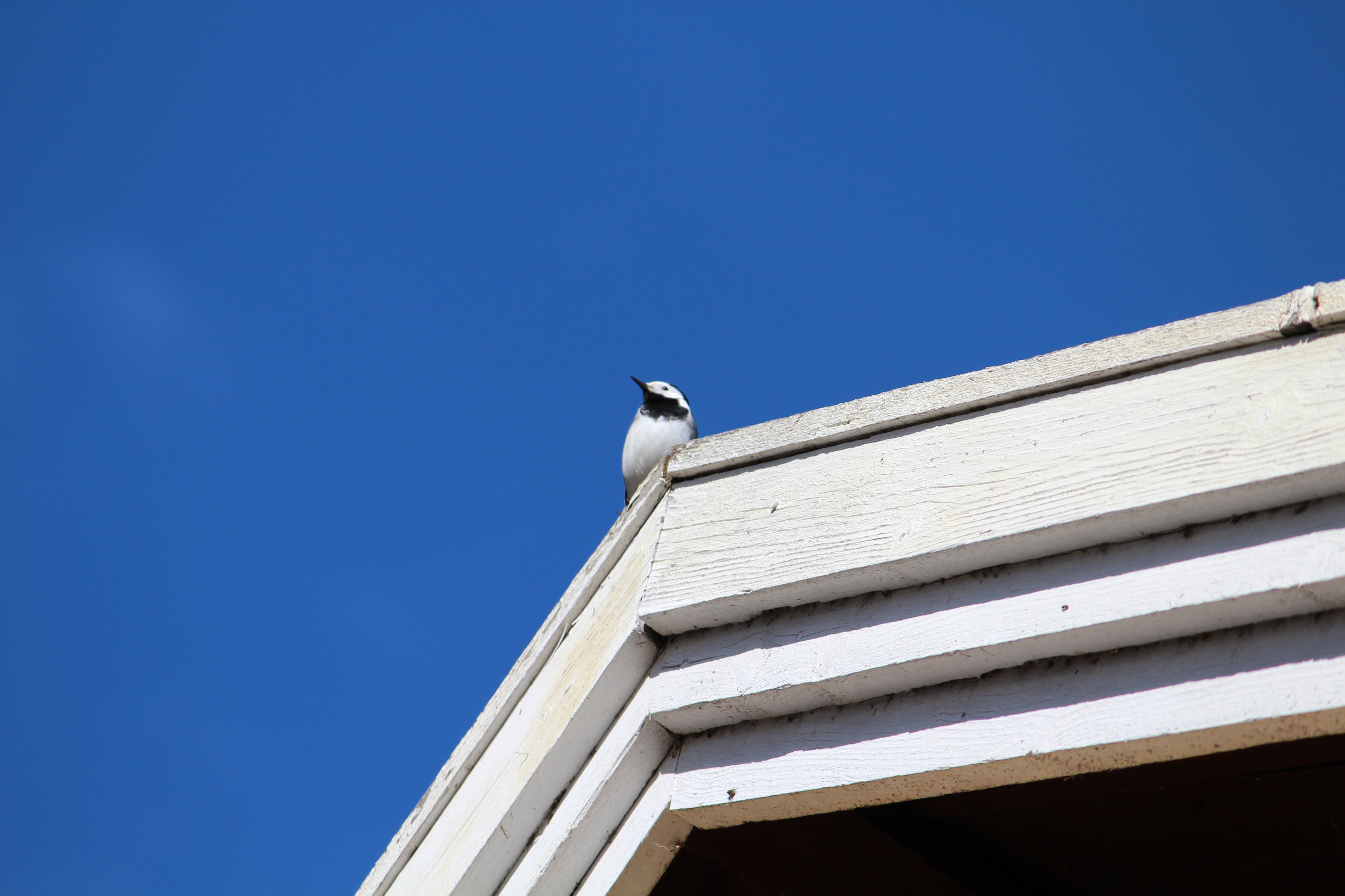 And look at this! The lovely white wagtail! It’s a dear guest, living under our roof tiles every summer. This male is still alone, but hopefully he will have wife joining him soon. He’s sitting here looking down at us, peacefully singing and talking, wagging his tail, and picking a fly once in a while.