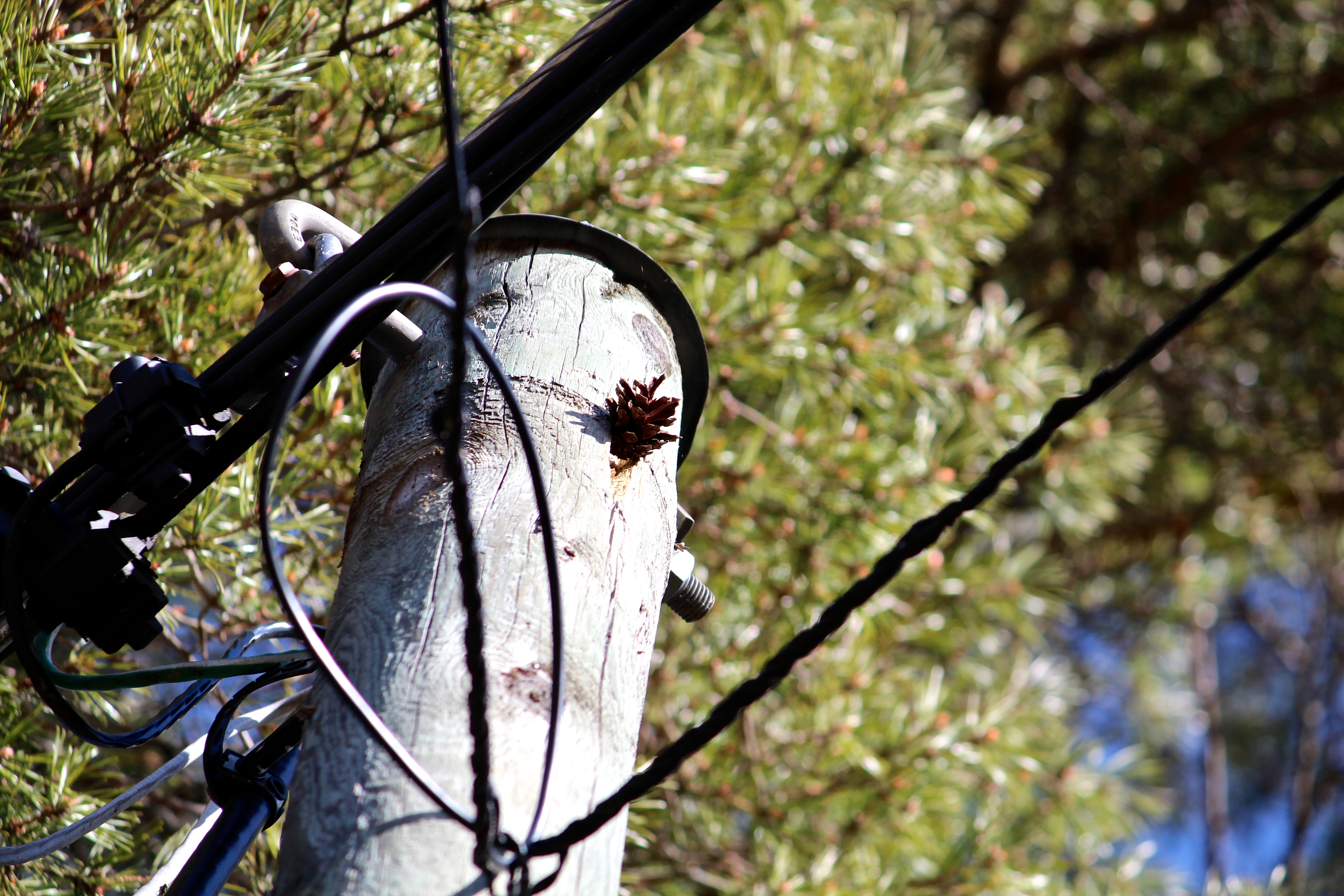 We have great spotted woodpeckers living in the woods that surround our house. One of them has it’s lunch table in the pylon on our back yard. It’s pecked a hole in it, and there it attaches a cone from spruce or fir and picks out the seeds.