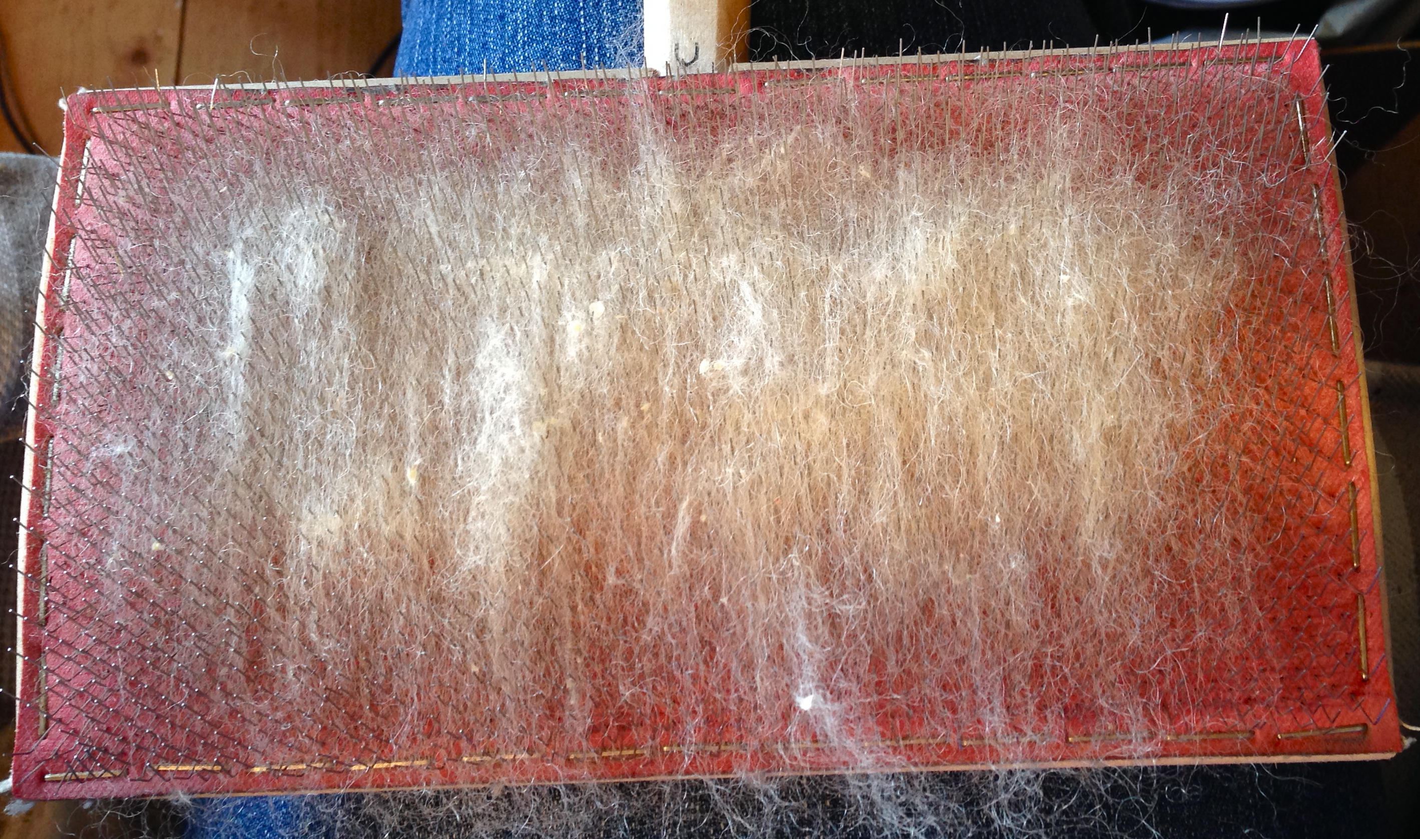 Now why on earth did I do that? The wool is short, and could easily have been carded into real rolags for soft woolen yarns. Because I almost destroyed the fleece when scouring! It felted, and carding was a pest. For several months I attempted thorough teasing by hand, flickring, beating, but nothing made me happy. So one day I took my Valkyrie combs designed for short, fine wool and made a test: it worked! I lost pretty much valuable fleece in the combing process, but on the other hand I saved some for really nice semi-woollen yarns.