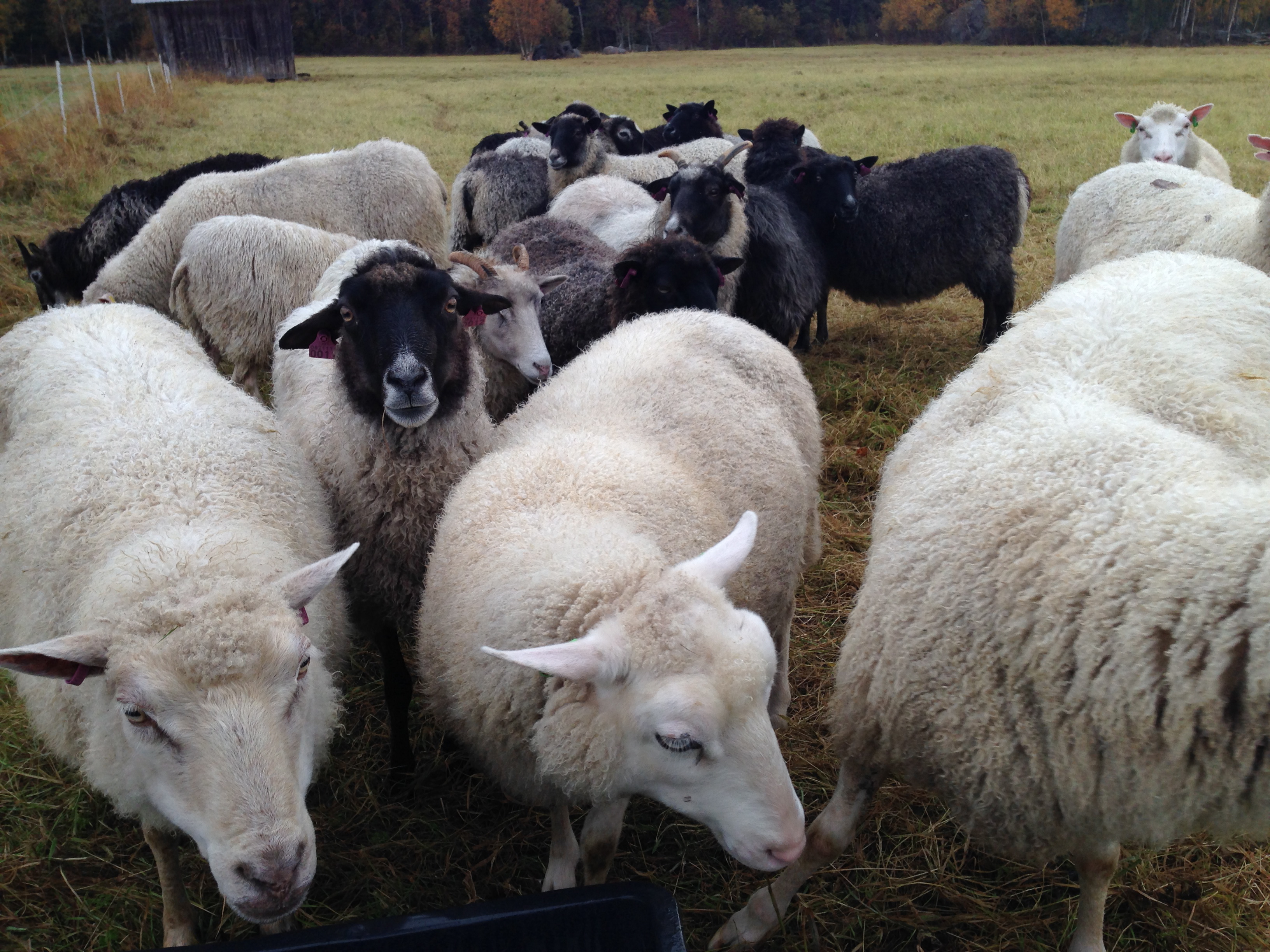 She has soft, fine, and nicely crimped wool with almost no vegetable matter at all, and no felting whatsoever. There’s Finn and Åland sheep in the herd, the Ålands are horned, the Finns polled. You can see more photos on my old blog.