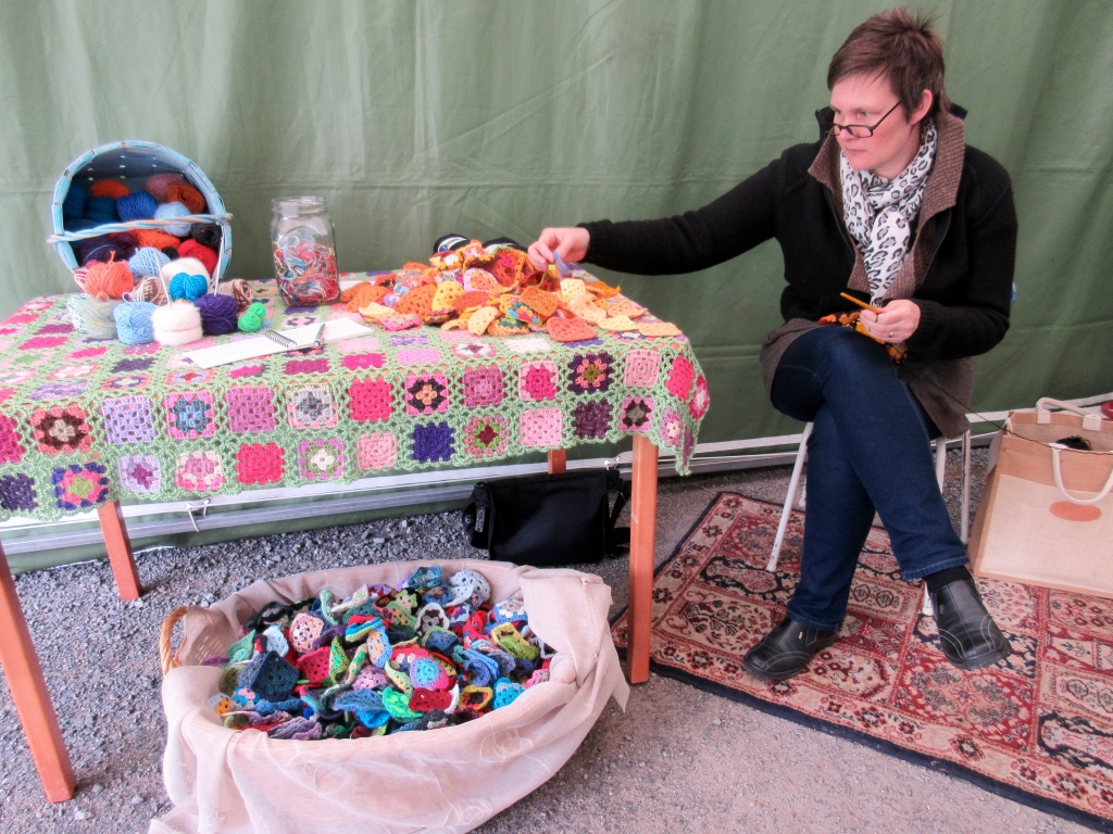 Här sitter Maria i ett tält och monterar en filt av mormorsrutor. Nån timme senare flyttade vi inomhus, för trots att solen visade sig ibland var det kallt. Försäljarna i sina bodar var ordentligt påpälsade, men på söndagen blev det ändå väldigt kallt för dem. I husen runtom innergården fanns en keramiker och en dockhusutställning, och en Vänstuga där man fick mat och kaffe.