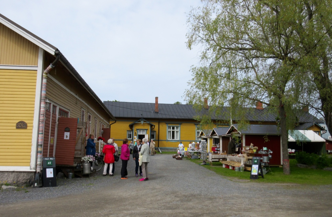 Knappmakerskan / Garnmorskan Maria och jag åkte söderut till Kristinestad för att virka och spinna i två dagar. Det var Öppna Portar i staden, man kunde gå in på folks gårdar och titta på deras vackra trädgårdar nu när grönskan är som skirast och vackrast, och försommarens blommor slagit ut. Det var också vänortsbesök från Danmark, och under de två dagarna träffade Maria och jag många turister från andra orter i Finland.