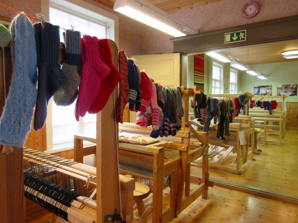 Maria och jag fick sitta i en underbar lokal: Kristinestads hemslöjdsförenings vävstuga. Arrangörerna hade ställt ut 150 par sockor som ska delas ut till behövande: