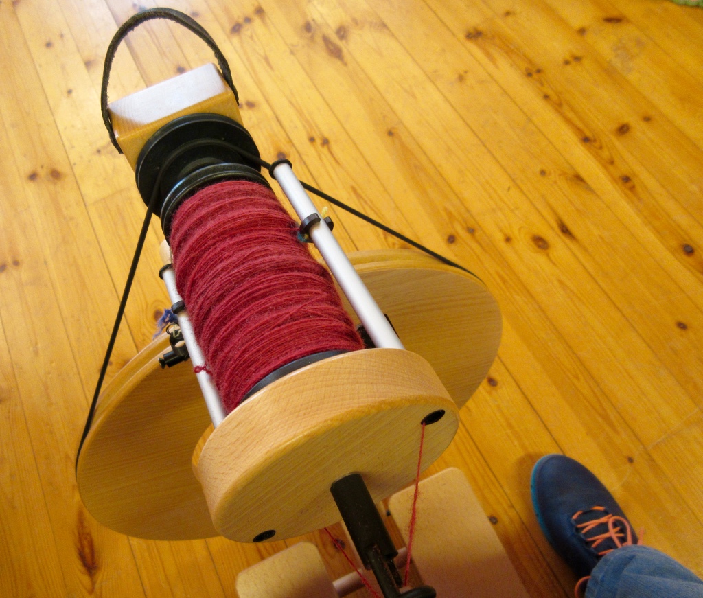 So I think that the wheel makers and spinners long ago came to a conclusion that the size most Saxony assemblies have now is optimal. It’s what this double drive wheel can do, and it does it just so well: a consistent yarn, spun with the fast and beautiful woollen long draw. That’s what I like to spin most of all, and the best way to spin it is on a good Saxony wheel. When I want to spin short draw I choose one of my uprights with Scotch tension: Louet Victoria or Hansen Minispinner.