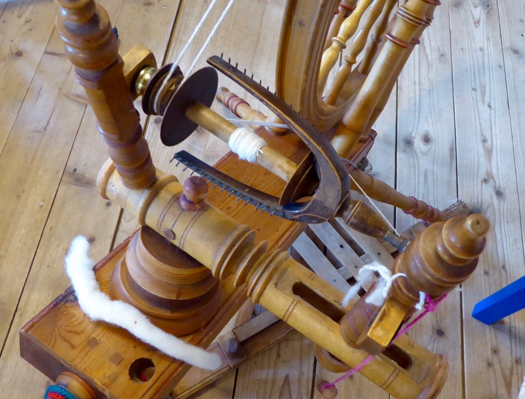 The distaff doesn’t belong to the wheel, but there may well have been one like that at one time. The flat, slightly curved distaffs where more common here, but distaffs formed like a thick staff or baton were also used. You can se some of the flat distaffs in the background: