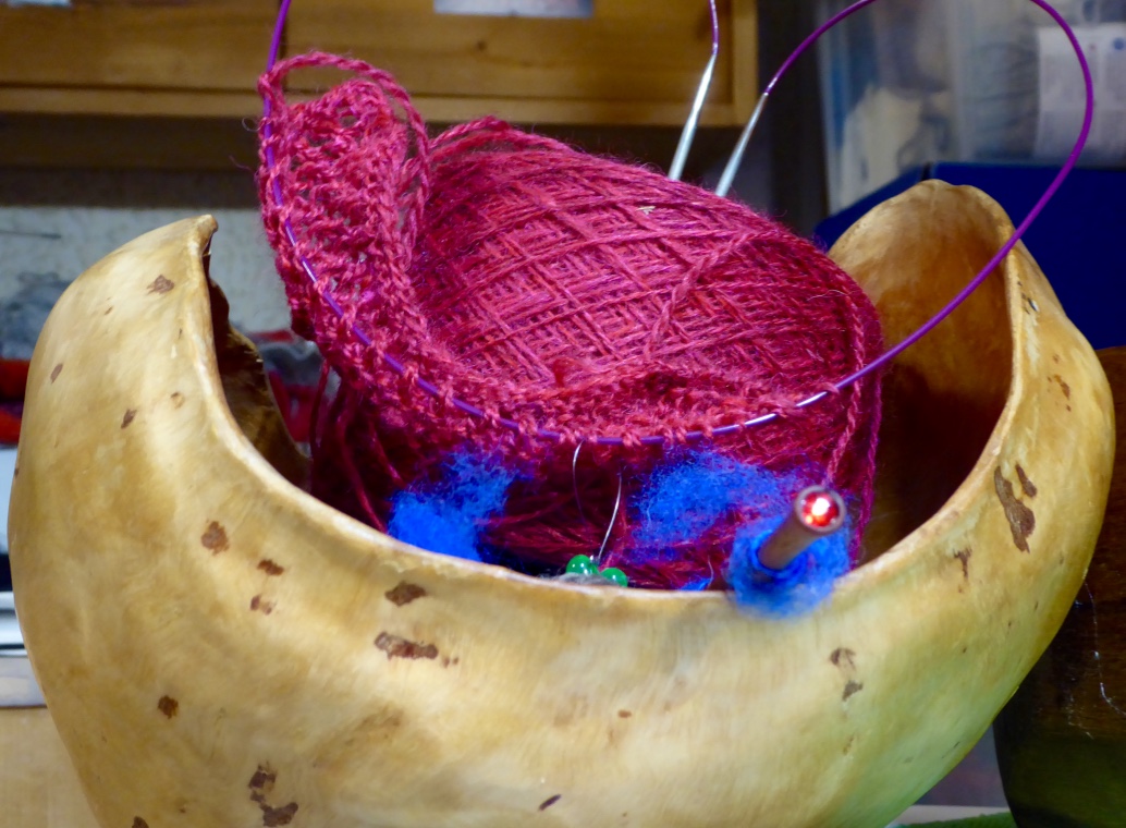 It’s a blend of BFL/silk dyed by my friend Britt-Marie in Sweden, shrieking pink longwool, red silk, tomato red Merino. I carded the fibers on the drum carder. It’s a strong, fine, soft yarn, I’m quite pleased with it. I use 3 mm knitting needles.