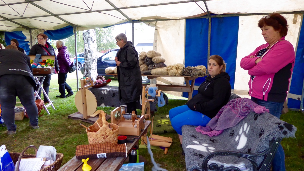 Then let’s drive over the bridge to Sweden. Hubby and I, and of course, Kasper the dog, drove some 100 kilometers north from Torneå to Överkalix, where they have a crafts event every August. I was to teach tapestry crochet and spindle spinning. I also met some of my spinning friends, who meet in Överkalix during the wool weekend that ends the craft week. It was a very cold weekend for them during the Spin in Public. It can be very warm and nice in Överkalix in August, as we noticed last year when it was hot and sunny. But not so this year. They were freezing!