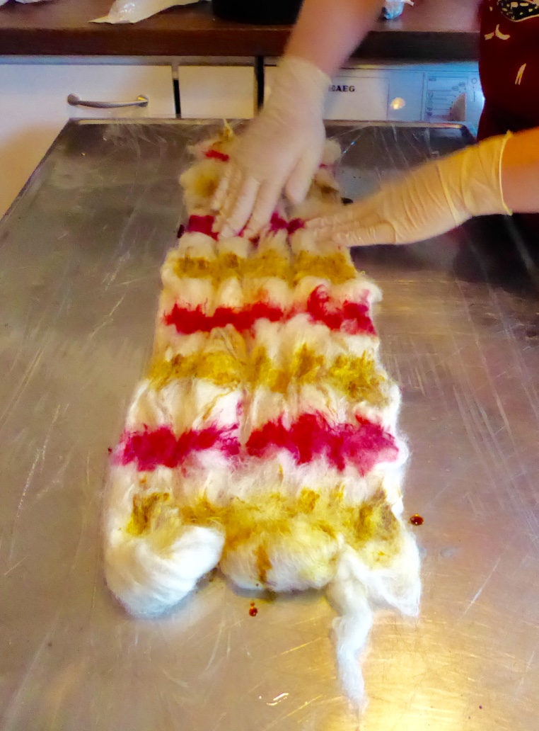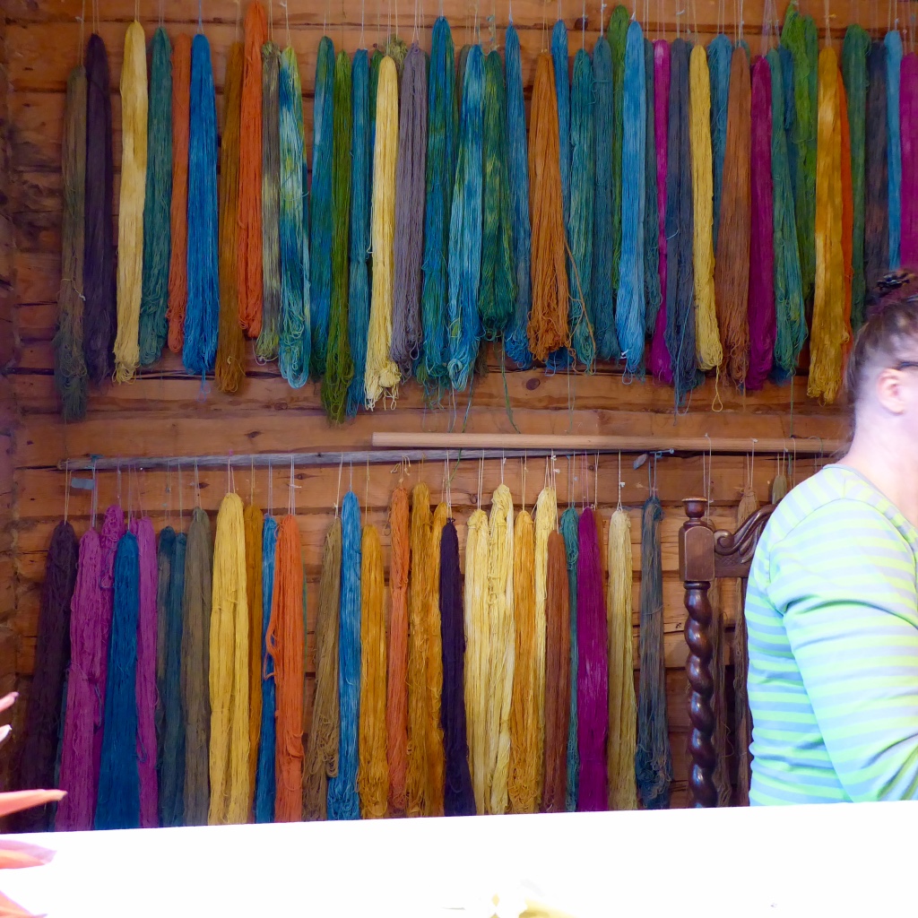 Sanski got quite excited and acid dyed a lot of top after we had left her alone so she could flip out in peace 🙂 I’m sorry I don’t have a photo to show! But here is her wall of yarns dyed with natural colours, all light fast. Her dyeing is magical!