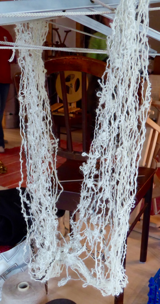 That’s a yarn spun by four spinners from different wools for the core, different types of mohair for the bouclé wrapping, and the same cotton sewing thread as binder. Please admit we were very clever and skilled! We also used different wheels: two upright Scotch tension, an antique Saxony, and a Hansen Minispinner.