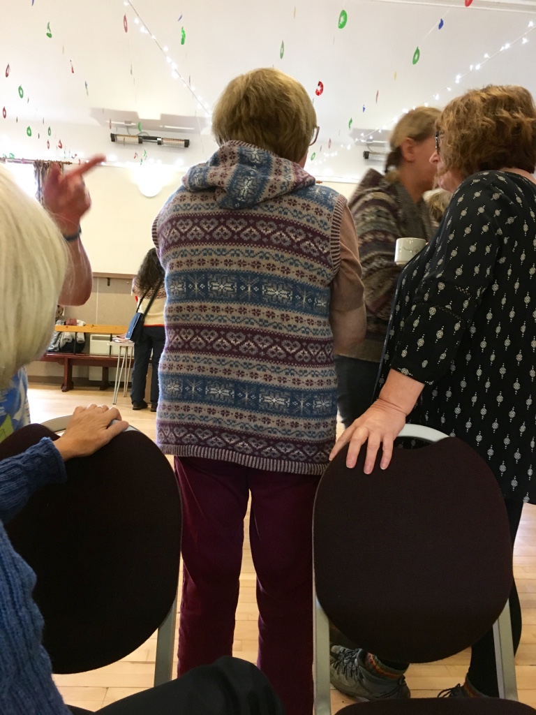 One of the ladies said it’s good that knitting isn’t taught at school anymore, because that gives the skilled knitters a chance to teach children that really wants to learn and not just play around. That was comforting to hear! As you may have noticed, there is great concern in Shetland about the future of Shetland knitting. I didn’t take photos of the children, but they were there, and they knitted, and they seemed to have great fun.