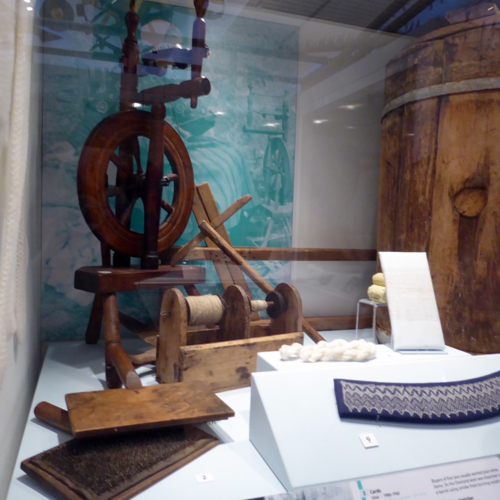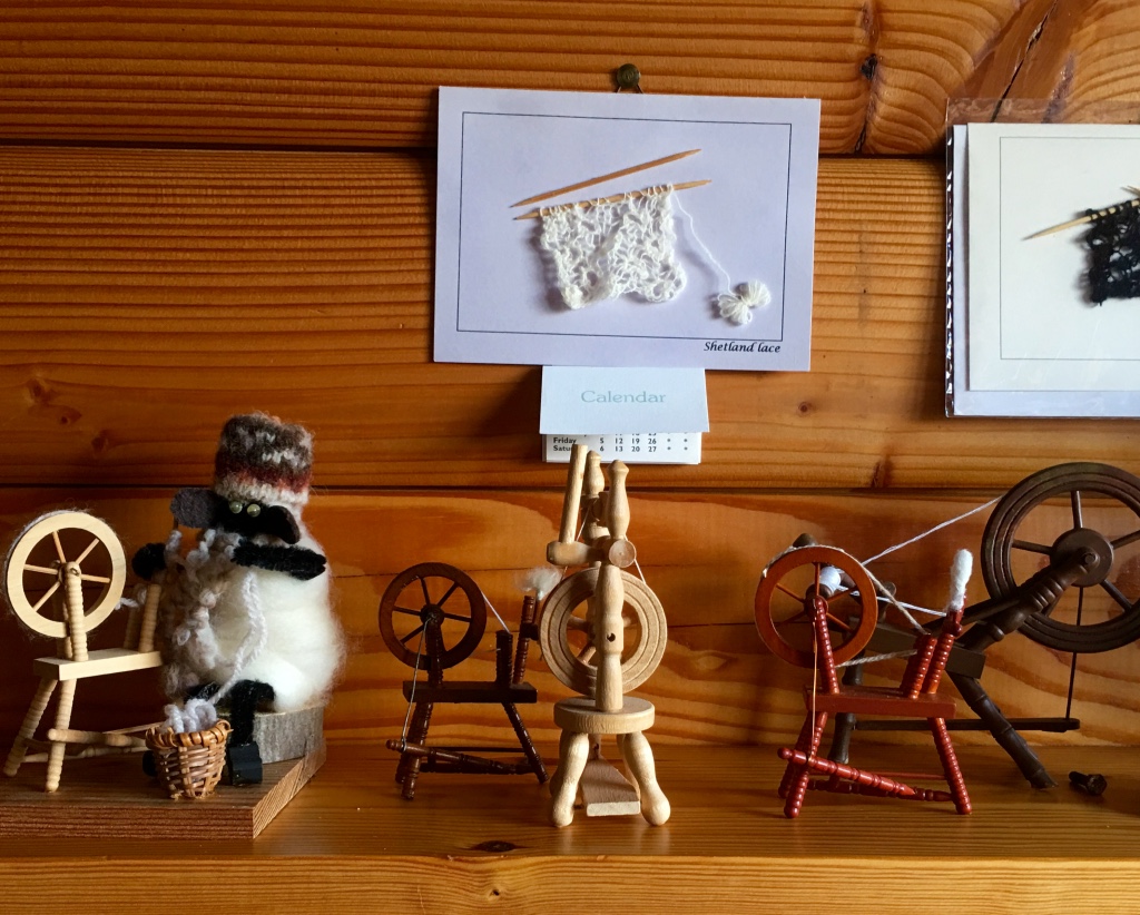 In the Hoswick Visitor Centre we saw this small Shetland spinning wheel. We saw many more of the same kind during the following week. Wheels like this have been used for spinning yarns for lace and sweaters in Shetland. There are still handspinners who know how to spin Shetland wool into the super thin lace yarns.