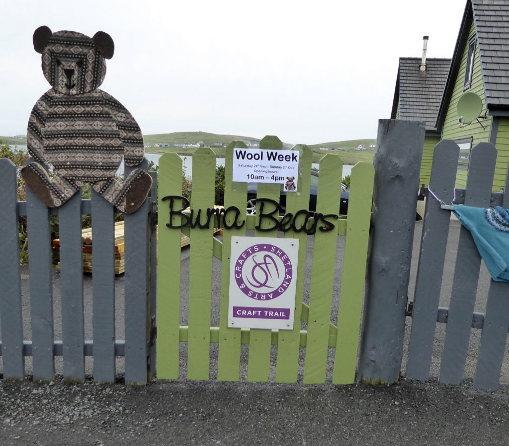 The Burra Bears studio is beautifully situated in Houss on East Burra, with sheep grazing on the hill slopes, and with the firth (I hope this is the right word for the bay between East and West Burra) on the west side. I didn’t take photos in the workshop, but here’s one from outside: