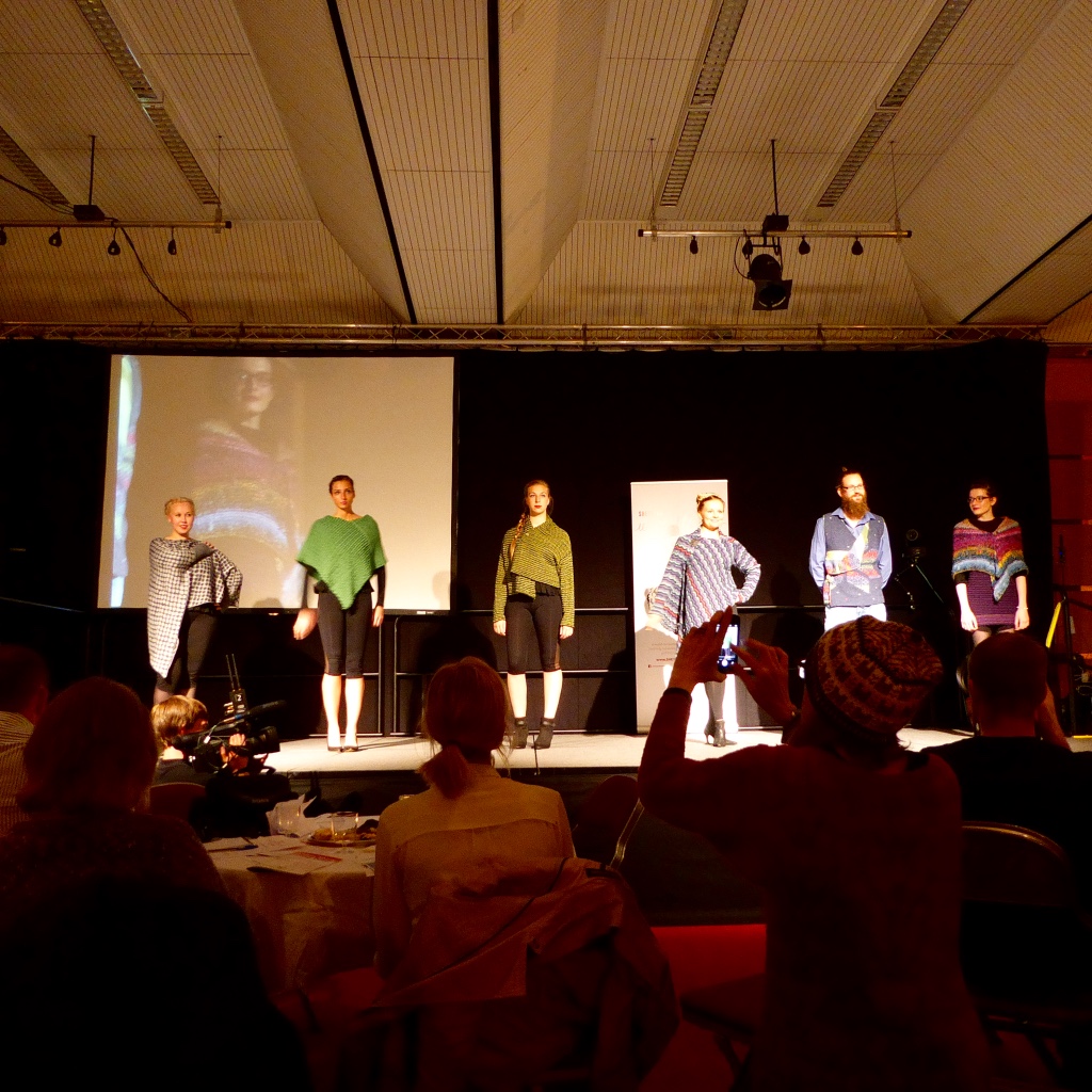 The Shetland Wool Week Opening Ceremony was a grand show with live music, a fashion show with garments made by renowned Shetland designers, good food and drink. Here’s Nielanell on stage. She designs garments that work like magic: they fit all types of figures.