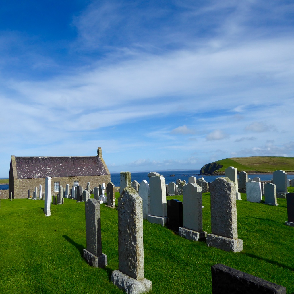 We had time to drive down to the beach near Jamieson’s, where you can see Papa Stour, one of the biggest islands in the Shetland archipelago. There’s a small church and a church yard, beautifully situated by the sea.