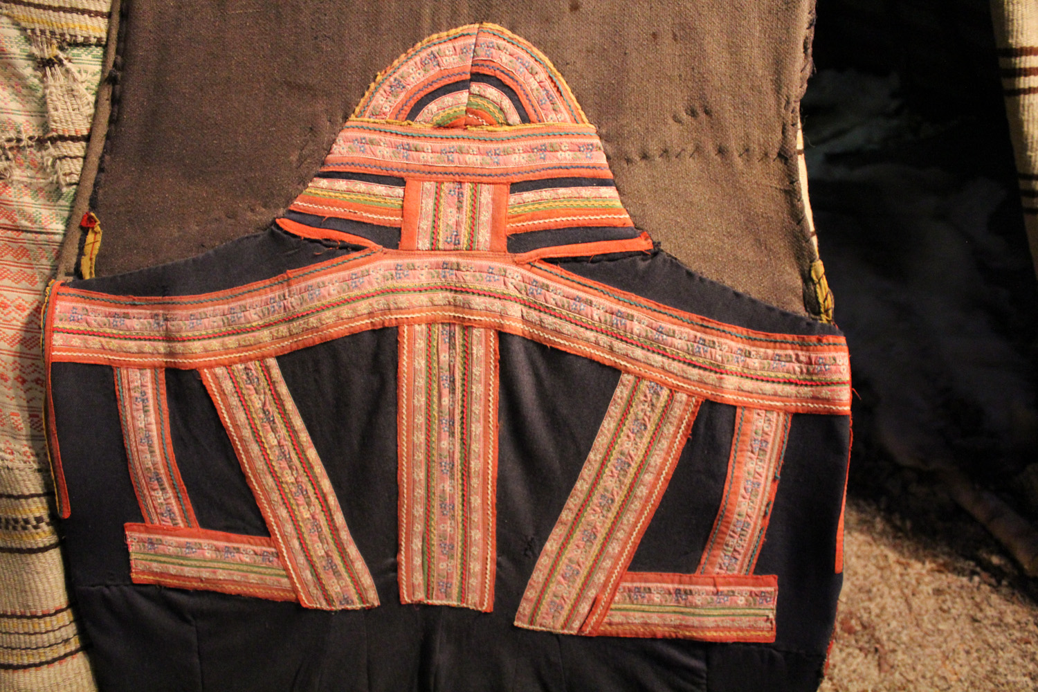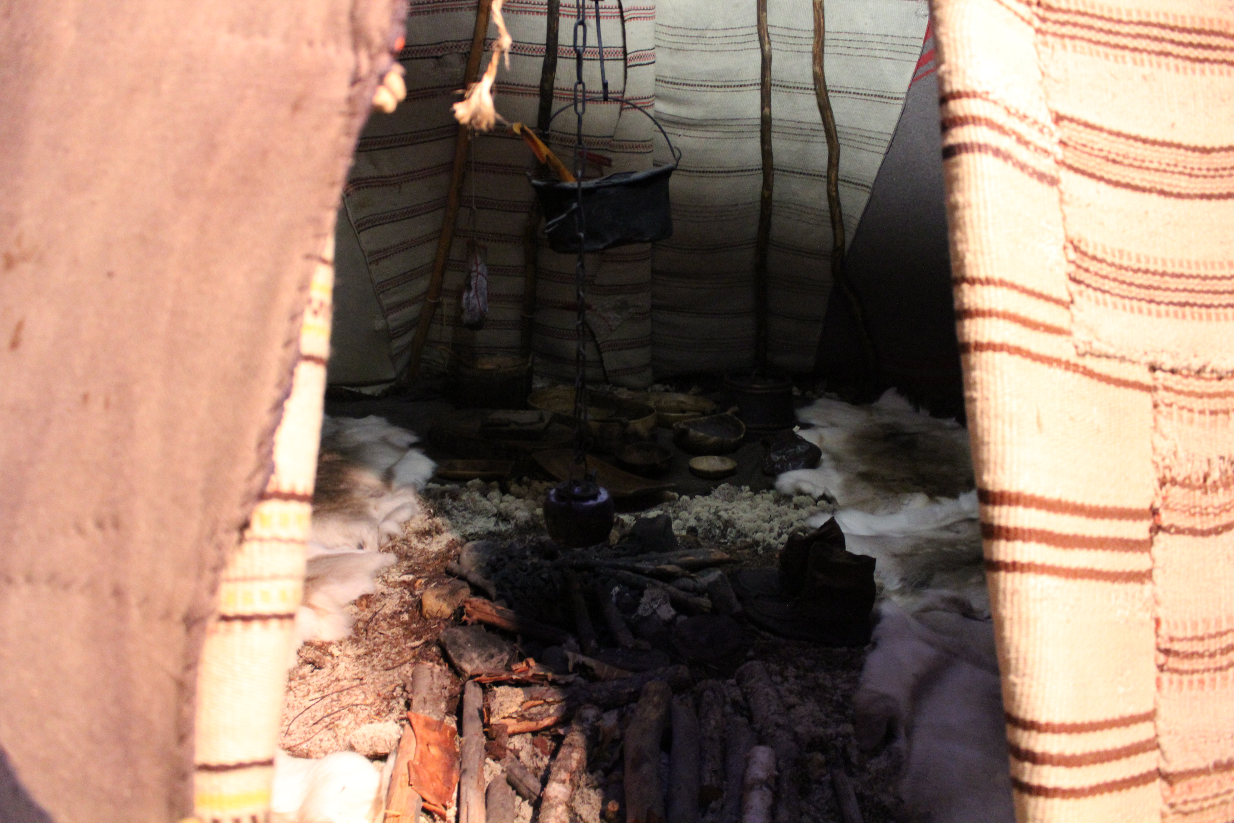 I hope the photos give at least a hint of how wonderfully the married couple have used the textiles they had. There’s cloth they have bought, as in the man’s jacket, and home made as in the rough piece of fabric (woven in an oppstadgogn, the old type of upright loom) with patches from other fabrics in it. The last photo shows the inside of the tent with the hearth, cooking utensils, and beds of reindeer skins. The cloth hanging over the tent are symbolic Northern Lights.