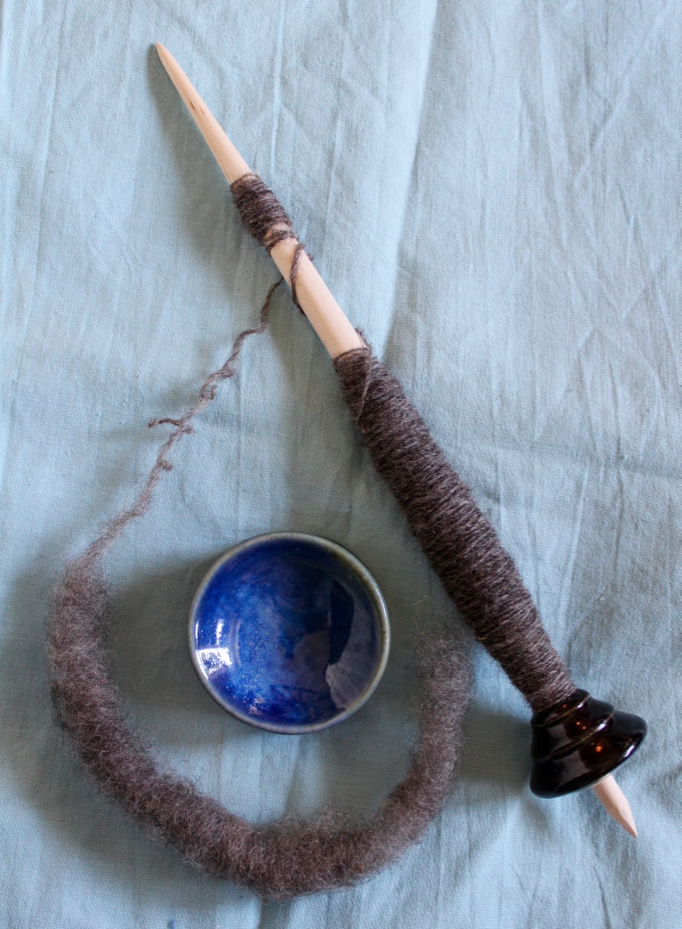 The wool i Grå Trøndersau, an extremely rare Norwegian breed that was thought to be extinct until a flock was found in the 90s. The breed has very fine and soft wool. The sample I have is also short, 2-3 cm, so carding and spinning on a supported spindle is the best way to spin it. Long draw on a walking wheel or Saxony wheel would also work fine. I found the lovely spinning bowl in IST’s booth at Woolfest some years ago.