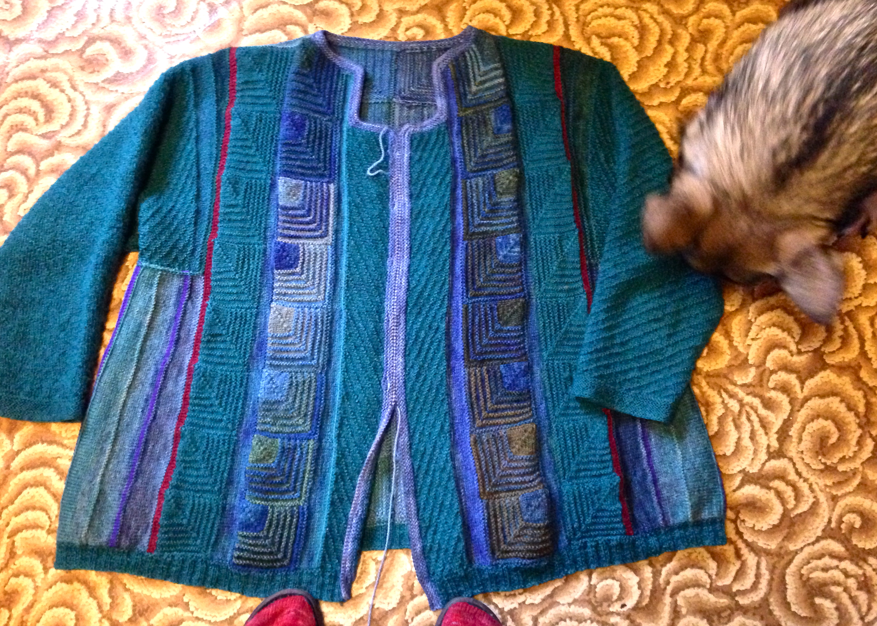 I knitted this cardigan from small hand dyed skeins and a teal commercial yarn. The mini skeins were dyed in beautiful blue, brownish, lilac and green shades by spinning friend Ingrid in Sweden. I loved the cardi, but the last couple of years it felt as if it didn’t quite fit me anymore. Today I turned it into a sweater by simply sewing the two front pieces together. Voilà – sweater! And it fits me again! It only needed to be more firm at the front.