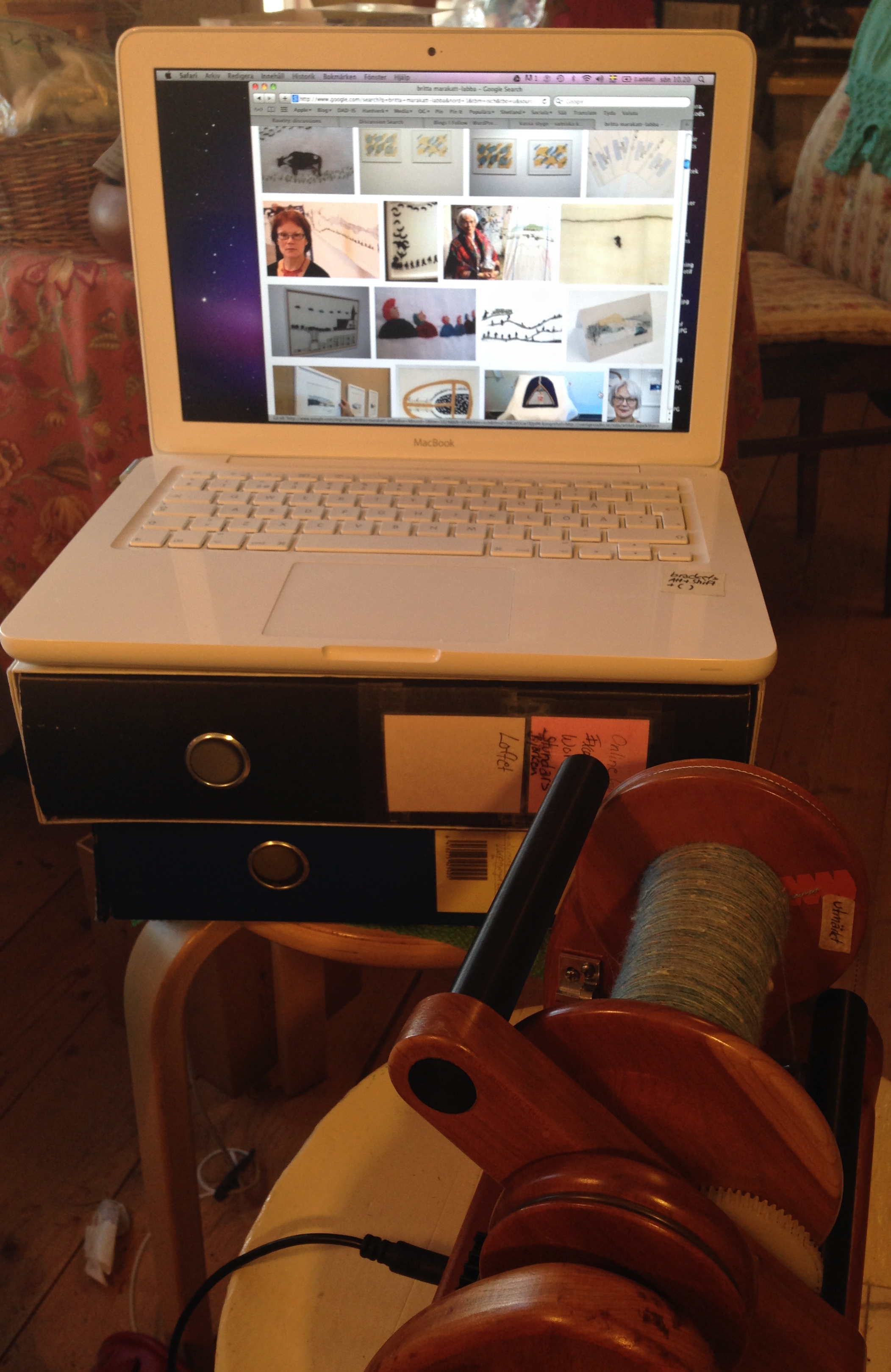 I listen to audiobooks, the radio, or podcasts while spinning. On this beautiful day with sunshine, so rare in November, and fresh white glittery snow, I listen to a program on the Swedish radio about Britta Marakatt-Labba. She is a textile artist with embroidery as her prime technique. Her art is delicate, but often also makes you think. She’s talking about her art, and how she sometimes adds pieces of fish skins or other traditional Sami materials to the embroidery, or how she uses woven flour bags with swastikas left behind by German soldiers during the second world war. She’s working on a picture that tells about the horrific bombing and shooting in Oslo in 2011. She thinks a flour bag with swastikas is a very suitable fabric to embroider such a picture upon, as the Nazi ideas and the ideas of the terrorist in Oslo are much the same. She pictures not only the nature and Sami culture, but also things that upset her. The radio program is called “Vassa stygn”, “Sharp stitches”.