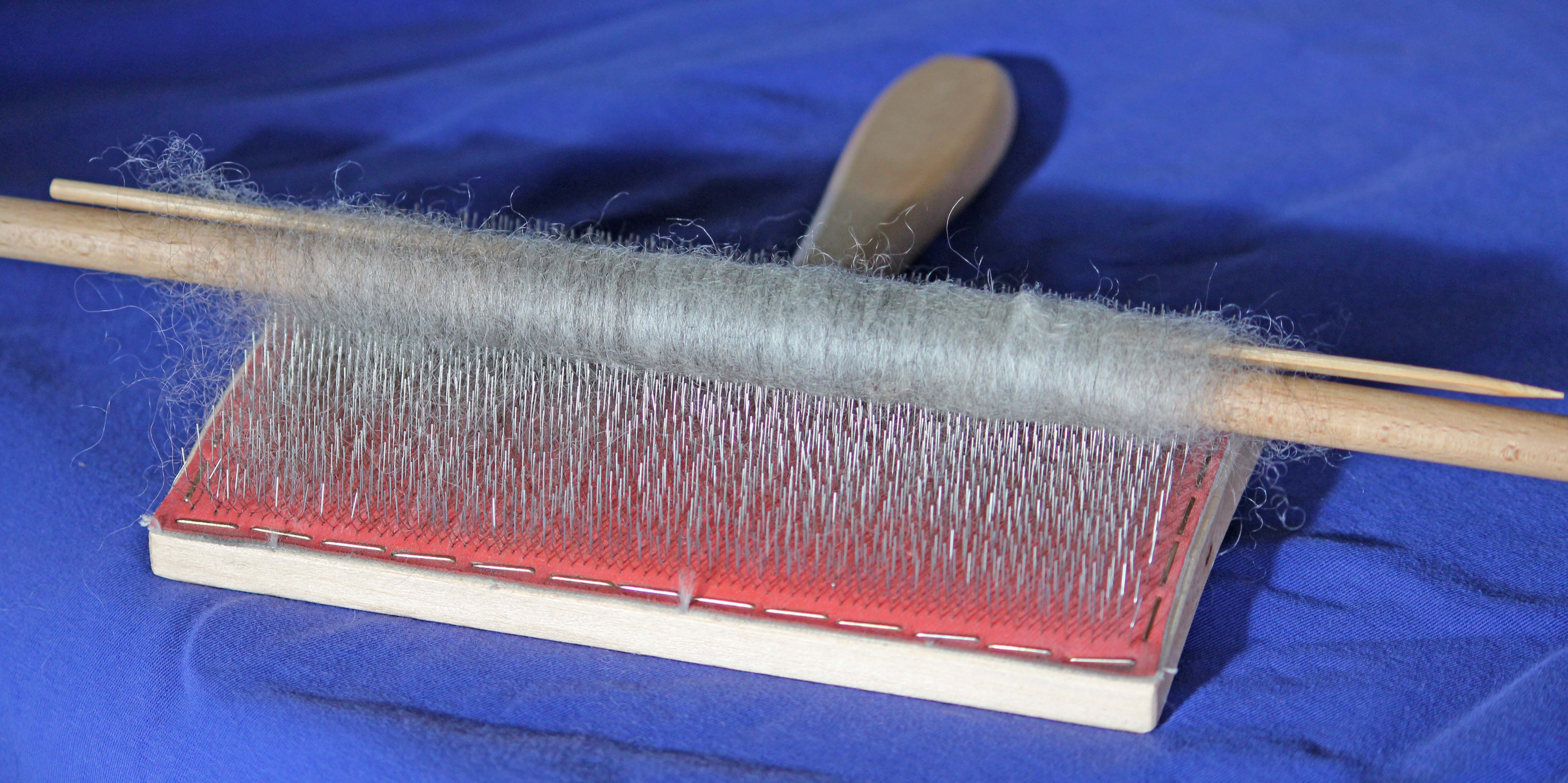 Now why on earth did I do that? The wool is short, and could easily have been carded into real rolags for soft woolen yarns. Because I almost destroyed the fleece when scouring! It felted, and carding was a pest. For several months I attempted thorough teasing by hand, flickring, beating, but nothing made me happy. So one day I took my Valkyrie combs designed for short, fine wool and made a test: it worked! I lost pretty much valuable fleece in the combing process, but on the other hand I saved some for really nice semi-woollen yarns.