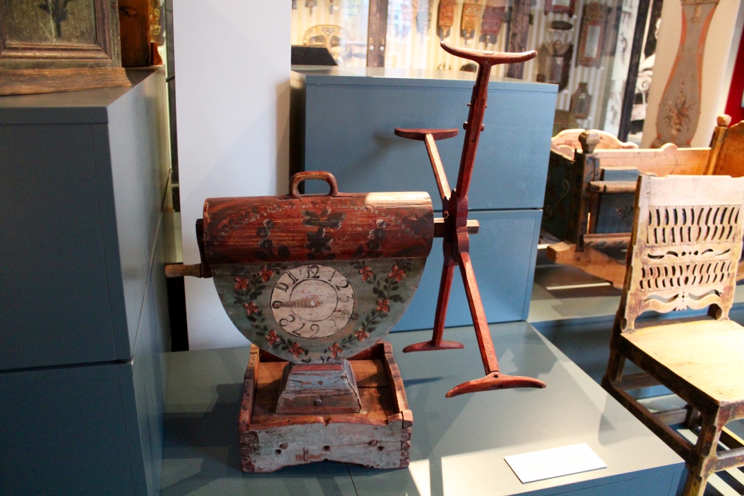 There was also another wheel that was added to the museum’s collection recently. It was made for Beata Mårtensdotter Grind in 1889. This was a more common type of wheel in my municipality, where most spinning wheels were painted blue.