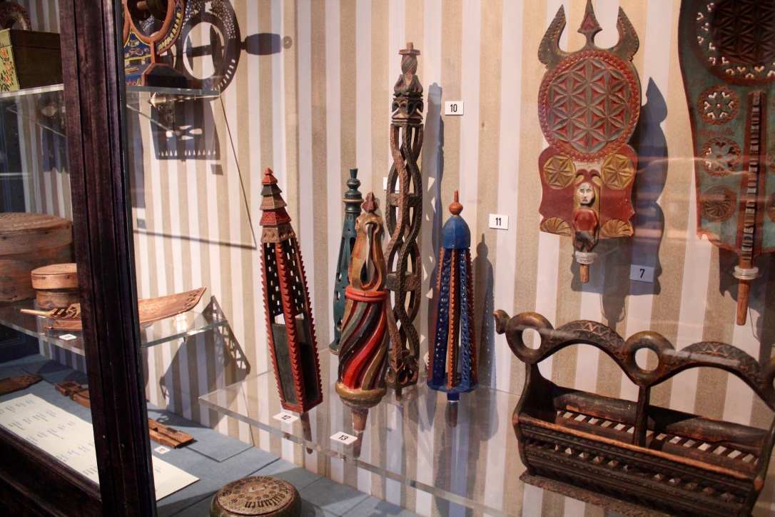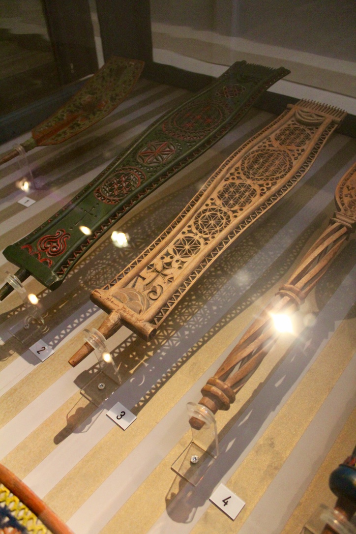 First some distaffs. Flax was grown in Finland until the beginning of the 20th century, and linen was used in clothing and as bedlinen until imported cotton became common. The museum showed three types of distaffs: the flat type with carved figures, the flat type with openwork carving or flower painting, and the oblong square or rounded type. Skilfully made distaffs were gifts from young men to their fiancés.