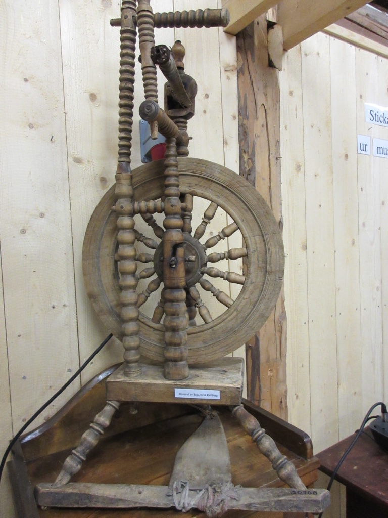 The museums have so many spinning wheels, that they can’t display them all. The one above is stuffed away in a barn at a museum in my municipality. I wanted to show it because I believe this kind of wheel must’ve been common. It’s a simple undecorated wheel that has clearly been in use. How many of these have been used as fire wood, as there’s no elaborate wood turning or painted decorations? It’s just simply a tool.