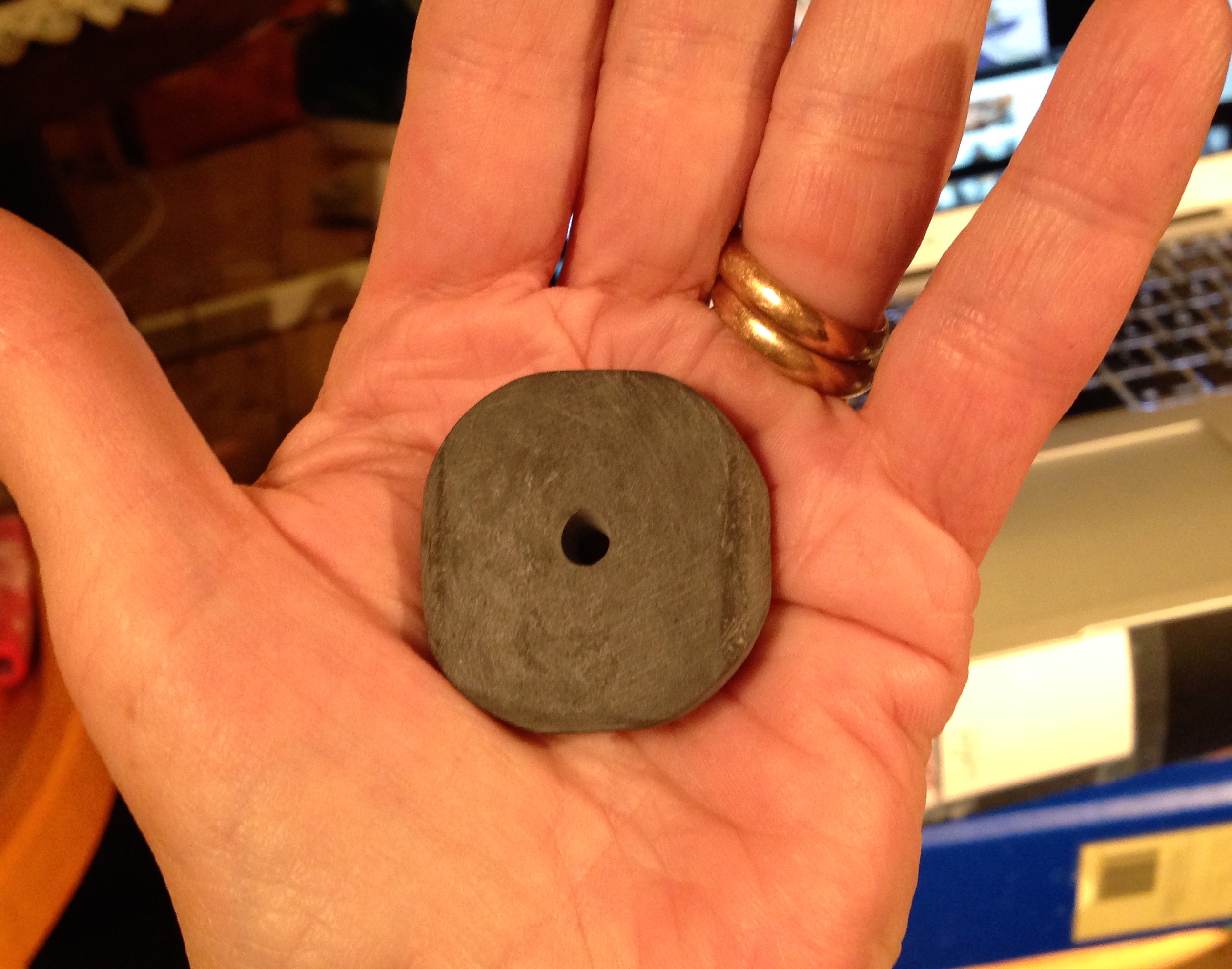 Then I took my coarsest sandpaper and a rasp and worked on the corners to make a somewhat circular shape, and also thinned out the thicker parts of the stone. It doesn’t matter if the whorl isn’t perfectly circular, as it’s a supported spindle.